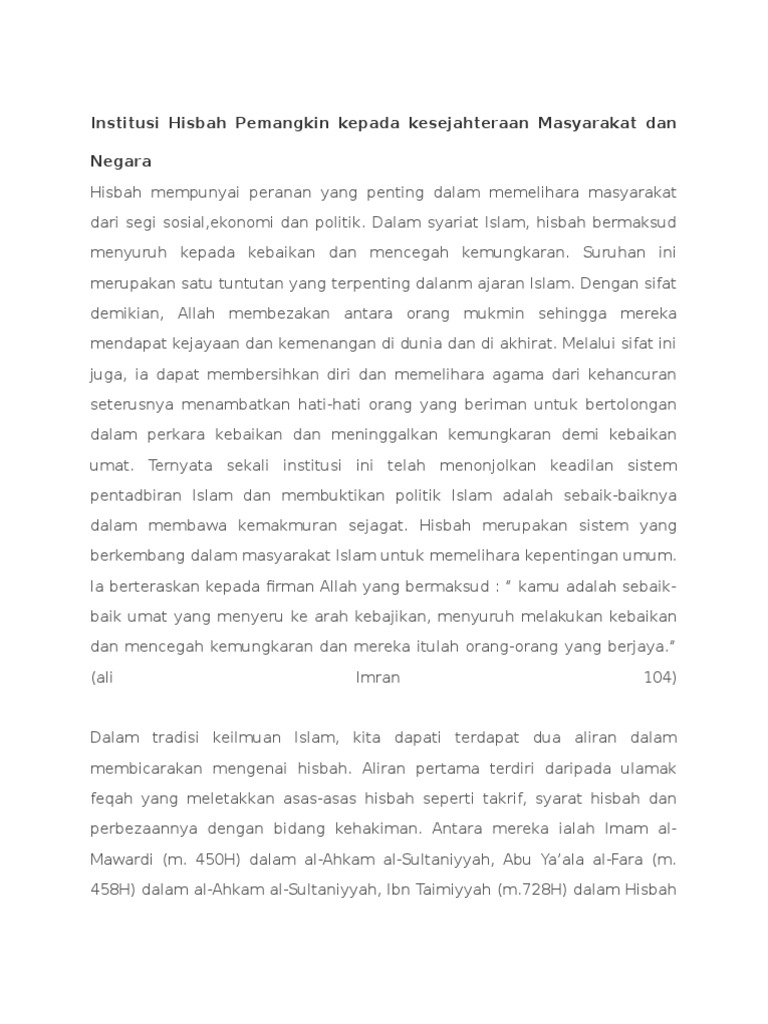 Hisbah merupakan aspek penting dalam sistem pemerintahan islam. Fungsi hisbah atau audit dalam sebuah negara islam khususnya dalam institusi kewangan amat penting dan wajib kerana ia mencerminkan kebertanggungjawaban juruaudit itu bukan sahaja kepada penyata kewangan, tetapi lebih penting lagi, kepada pencipta, allah swt. Fungsi moral institusi hisbah al hisbah merupakan pelaksanaan dari al amr bi al from titas 1013 at university of science, malaysia Hisbah juga sebagai sebuah institusi merujuk kepada sebuah badan yang menjalankan fungsi pengawasan bagi menggalakkan kebaikan dan menghapuskan kemungkaran. Pengurusan dan pentadbiran hisbah secara islamik sepenuhnya.